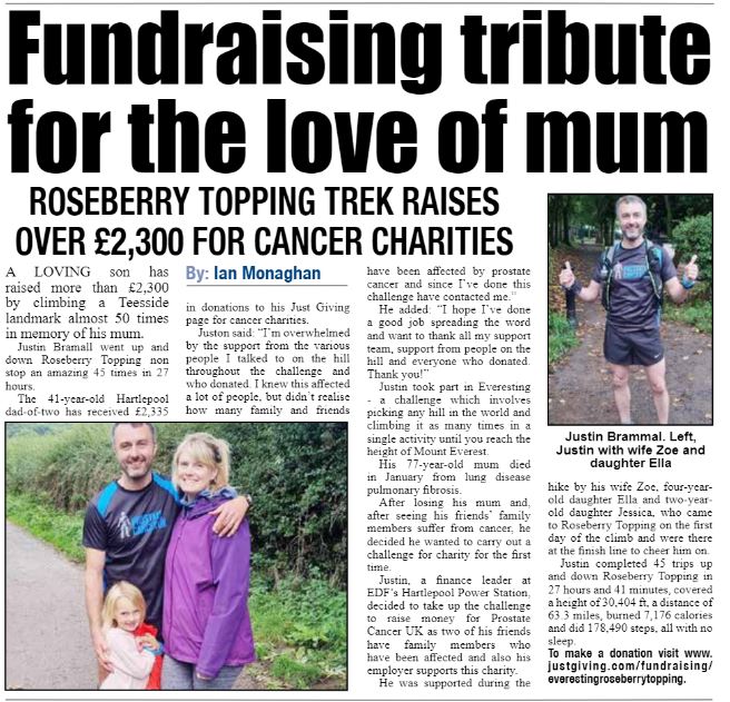 So after being inspired by previous multiple repetitions of Roseberry Topping in the quest to match or surpass the height of Mt Everest I thought I’d give it a go in the name of Charity (Prostate Cancer UK). I’ve always talked about doing something for charity, but just never got around to actually doing it. After my mother passed away this year I thought I really ought to do something for charity and not necessarily just because, more so because why not.